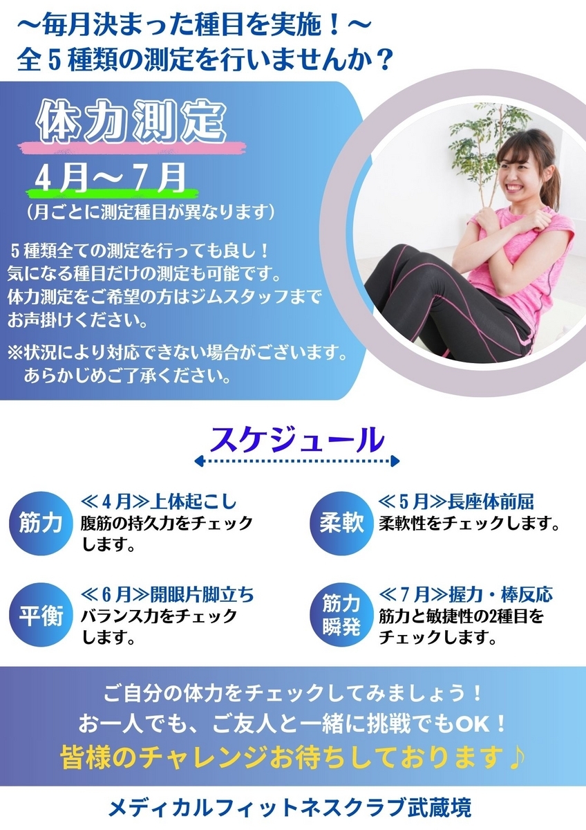 さて、今回は今月から始まるイベント「体力測定」のご案内です。